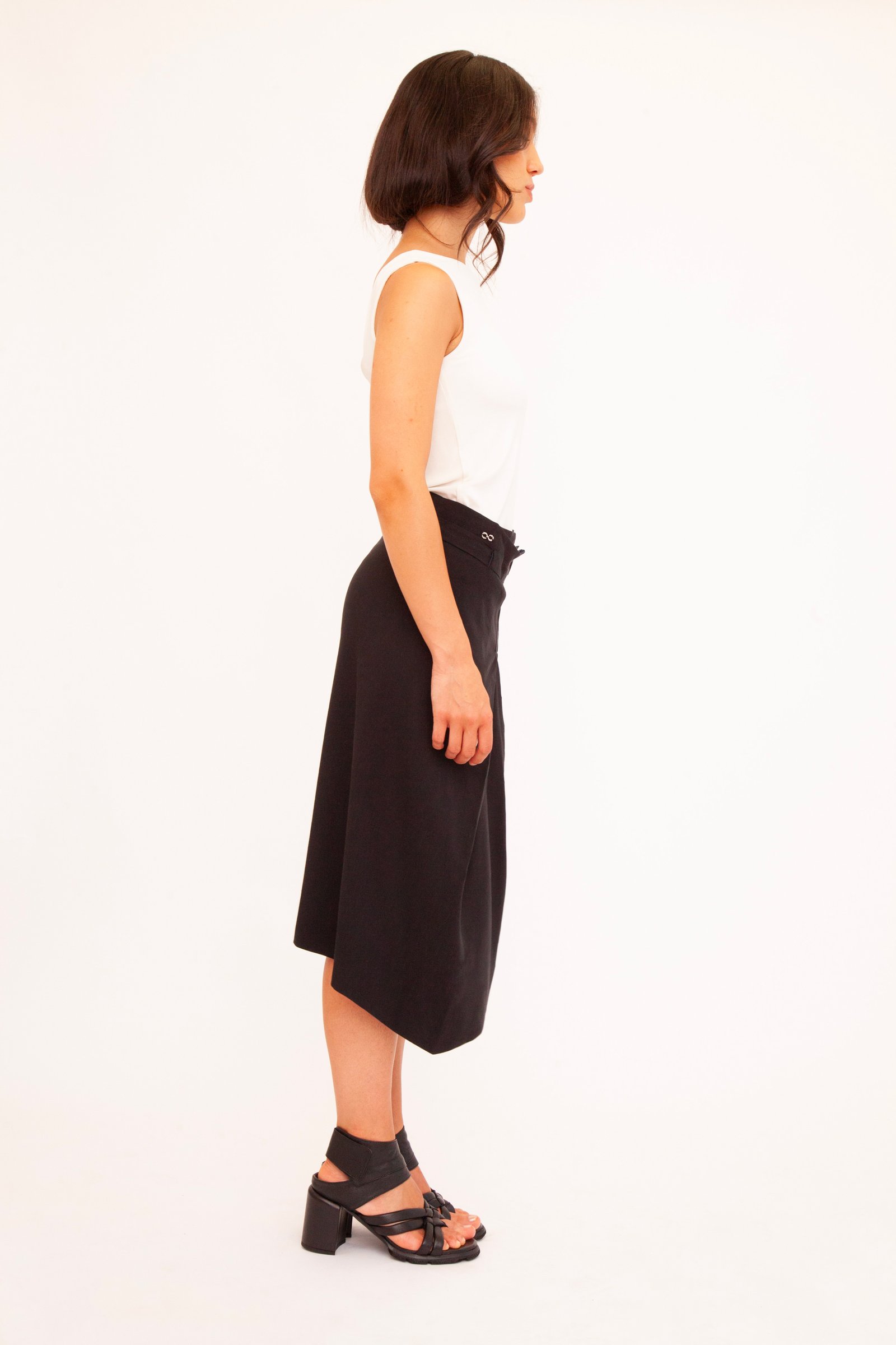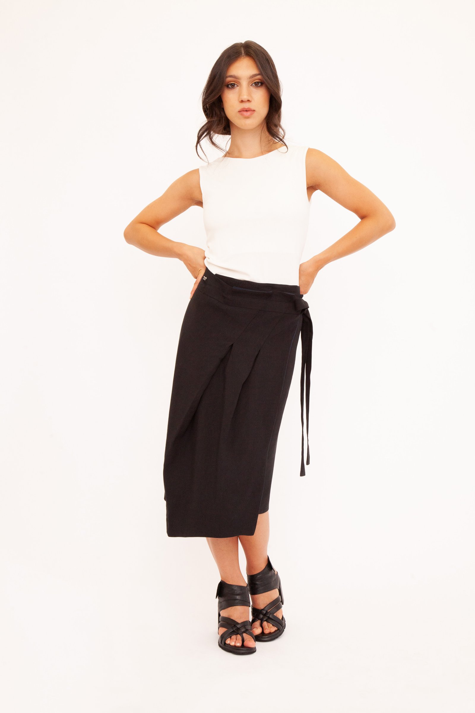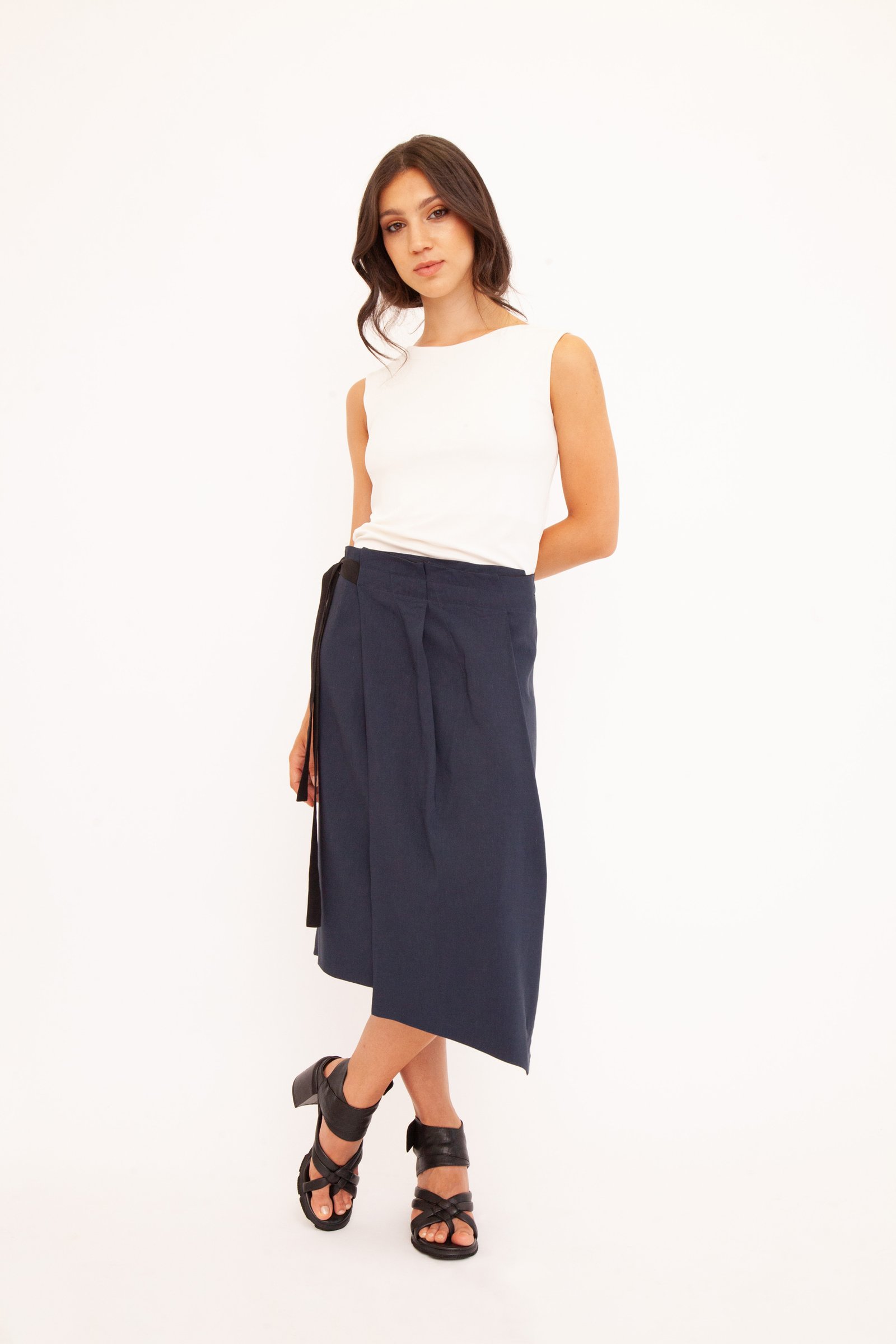 Due look in un unico, magico capo. Questa gonna double face in lino e viscosa ti permette di cambiare stile con un solo gesto. La vestibilità è regolabile grazie a un’elegante allacciatura a fiocco, mentre le due pieghe frontali donano un movimento armonioso. L’essenza della versatilità sartoriale.