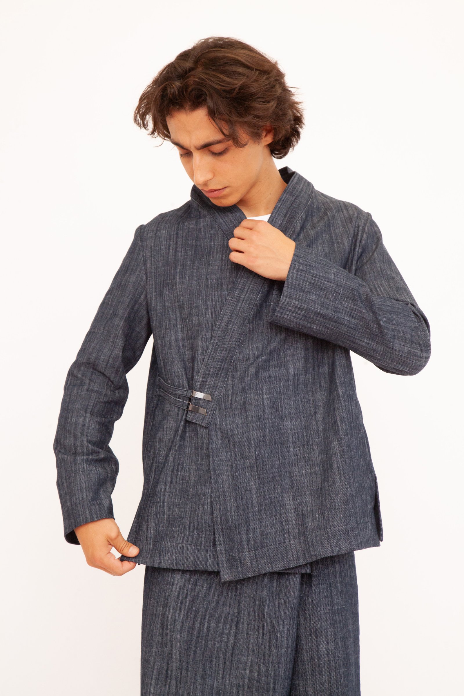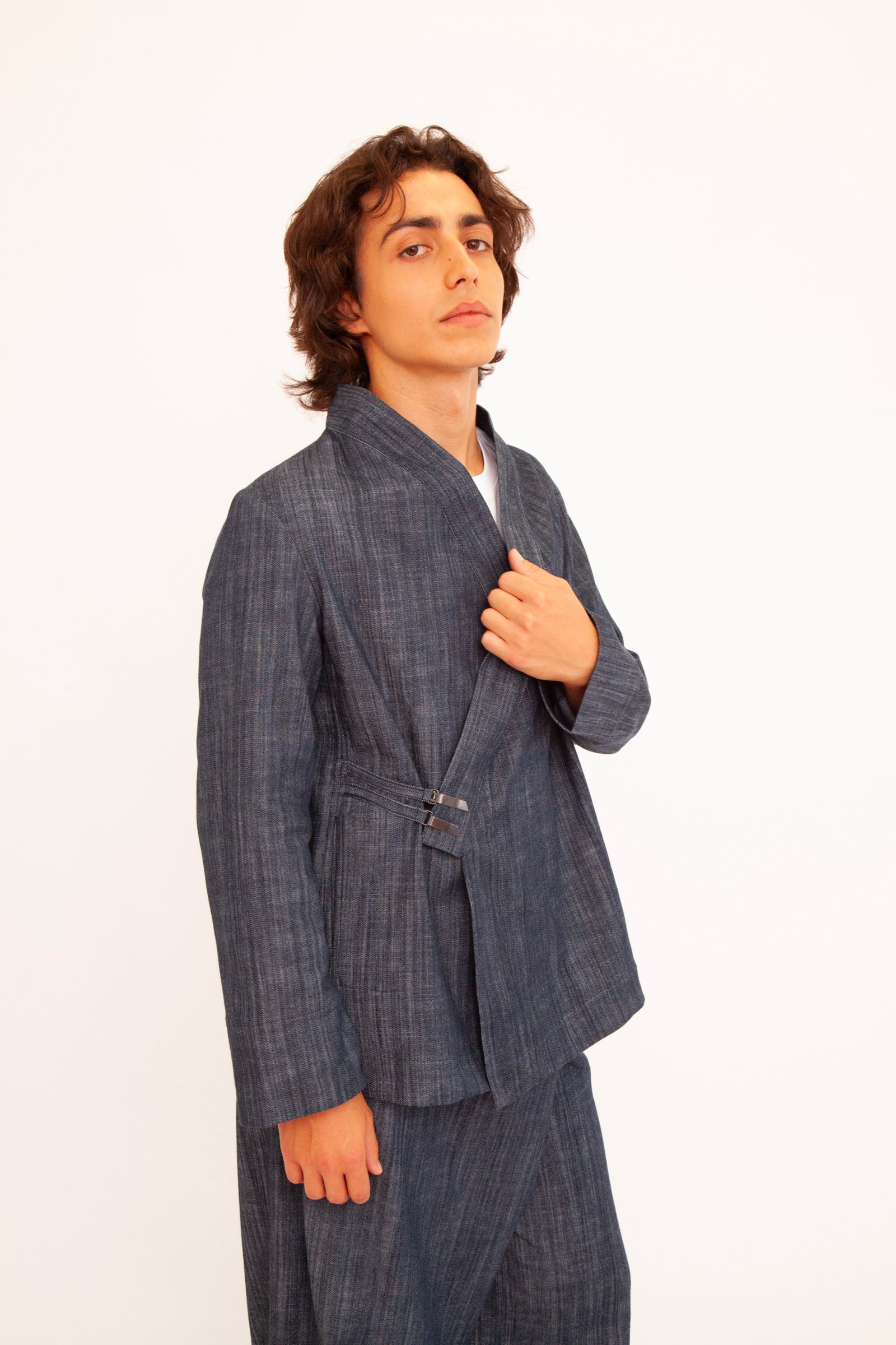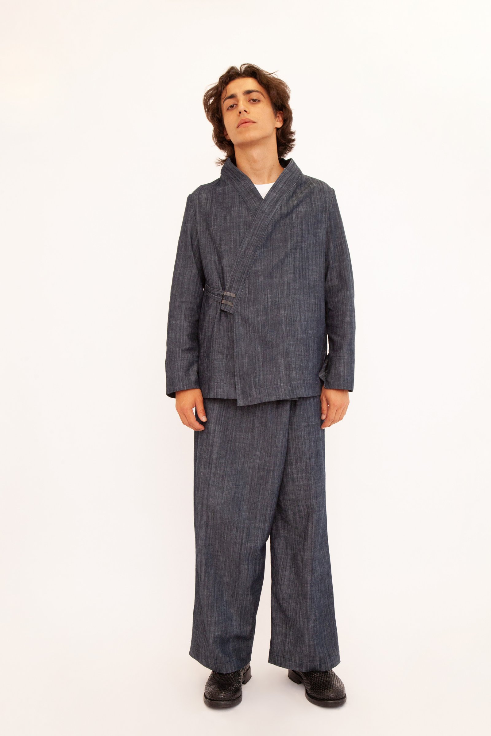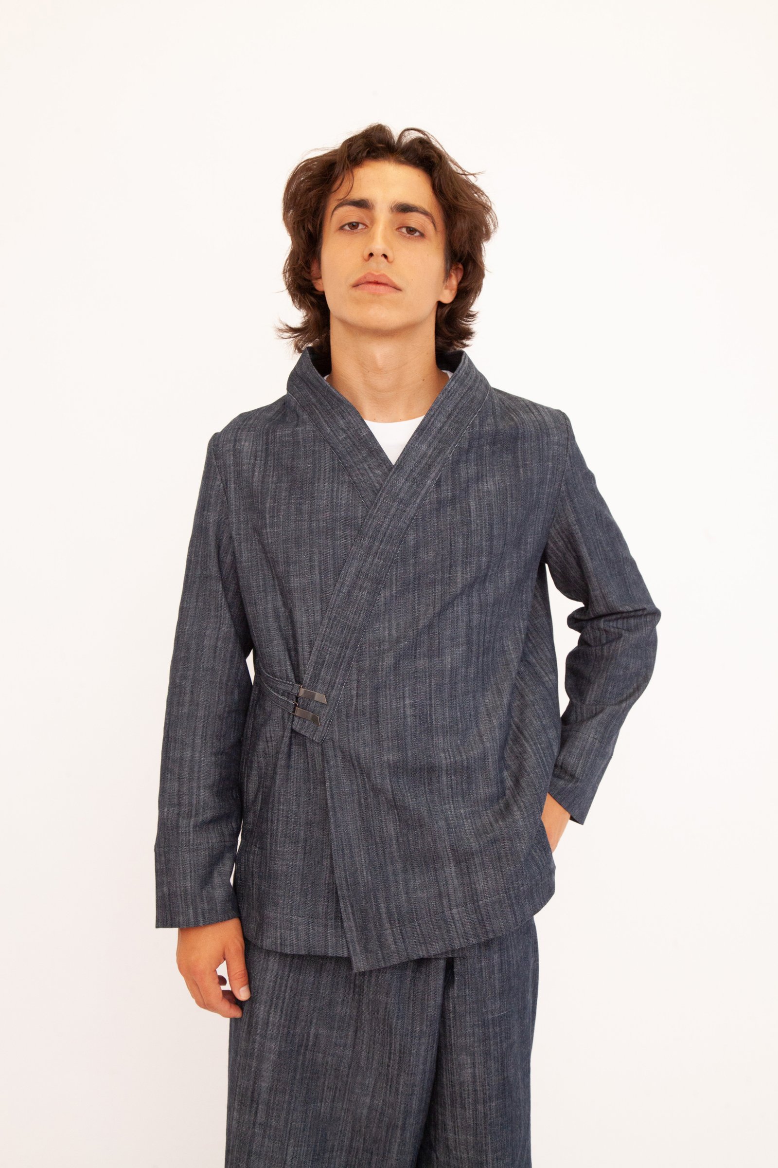 Un’opera di stile unisex e versatile che fonde l’eleganza casual con un design originale. Realizzato nei toni profondi del blu e del nero, questo kimono è perfetto su un jeans per un look metropolitano o abbinato ai suoi pantaloni per creare un completo sofisticato. La tua tela di stile personale.