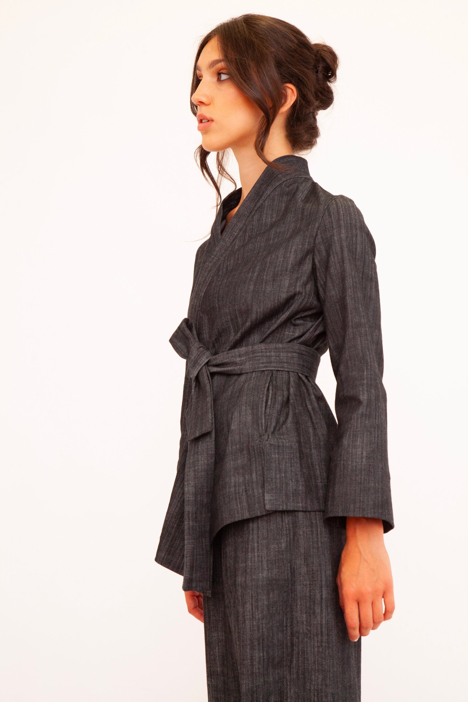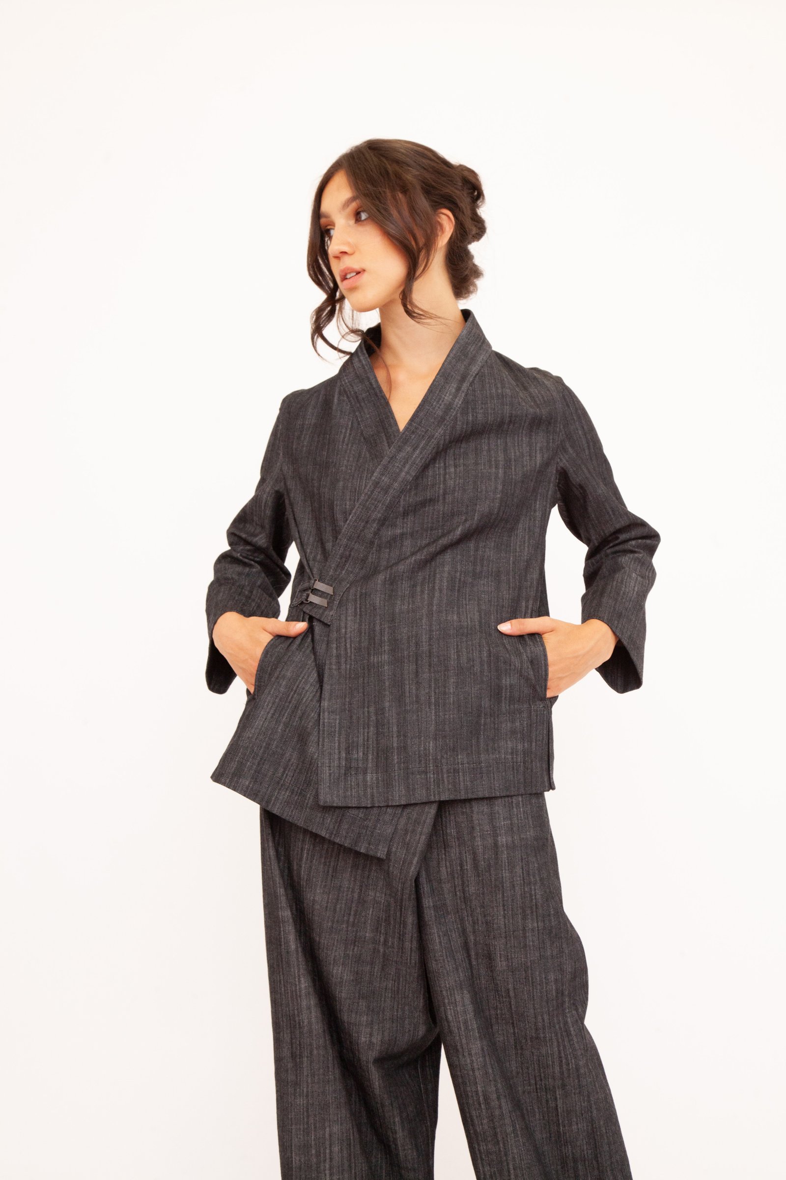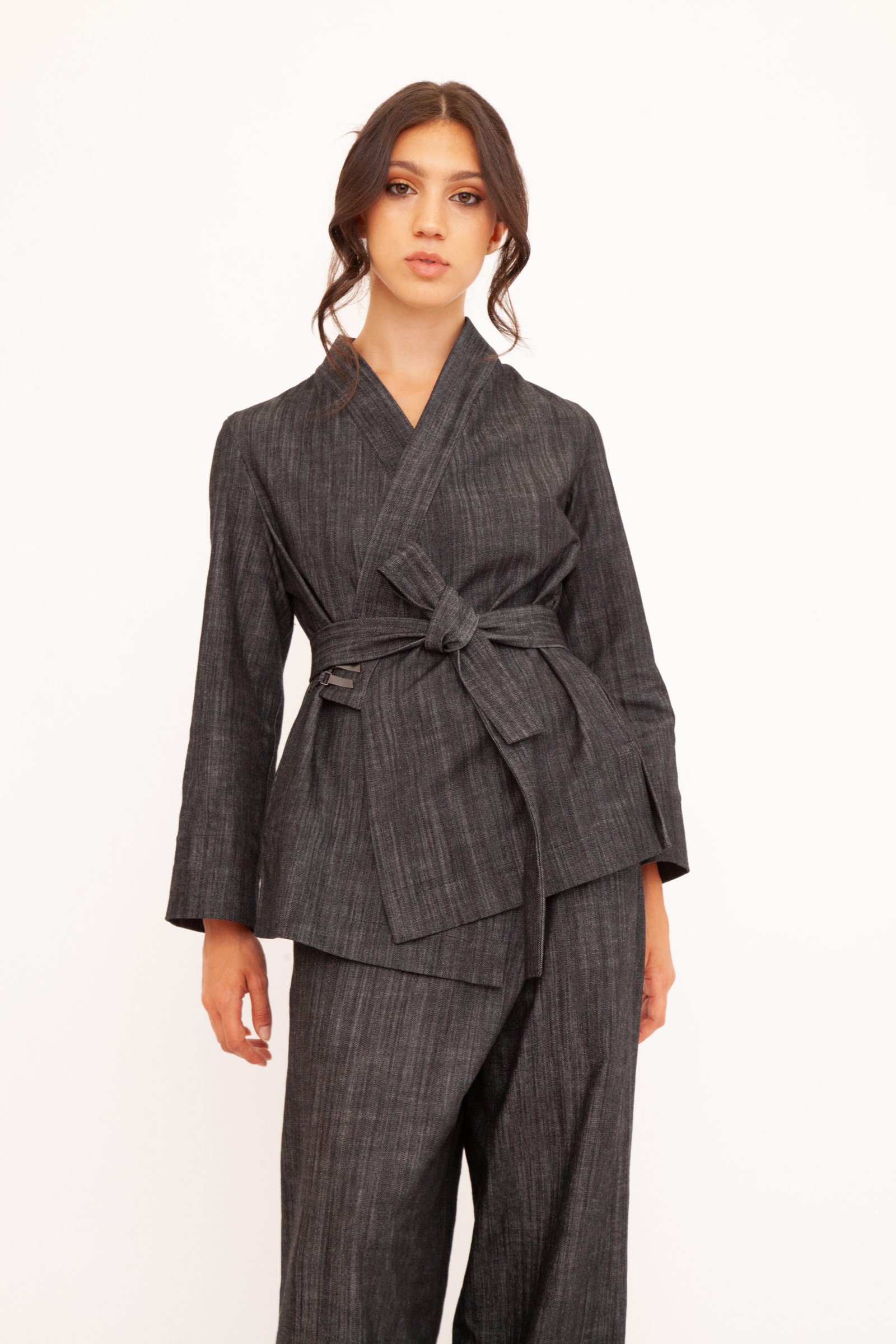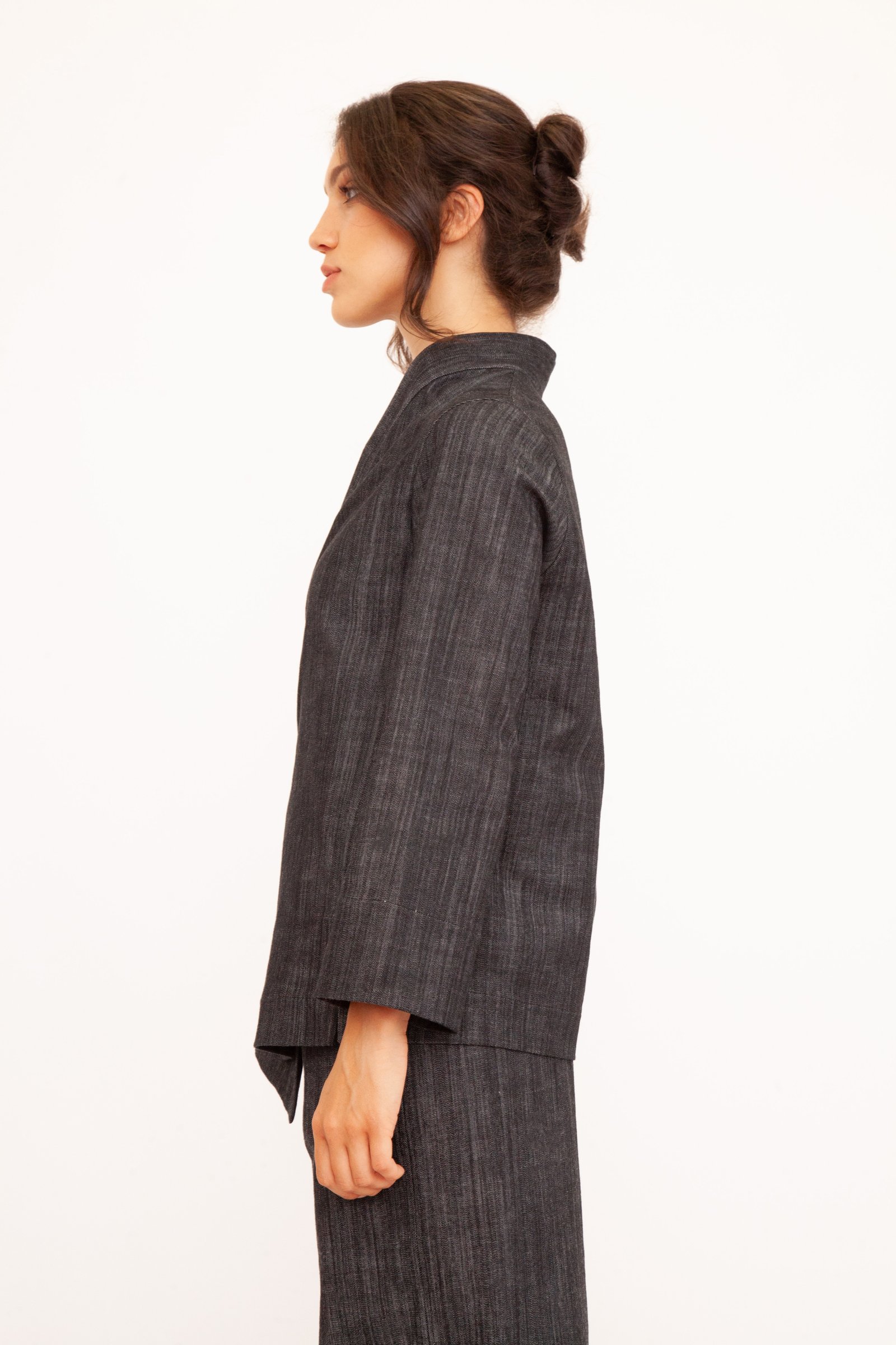 Un’opera di stile unisex e versatile che fonde l’eleganza casual con un design originale. Realizzato nei toni profondi del blu e del nero, questo kimono è perfetto su un jeans per un look metropolitano o abbinato ai suoi pantaloni per creare un completo sofisticato. La tua tela di stile personale.