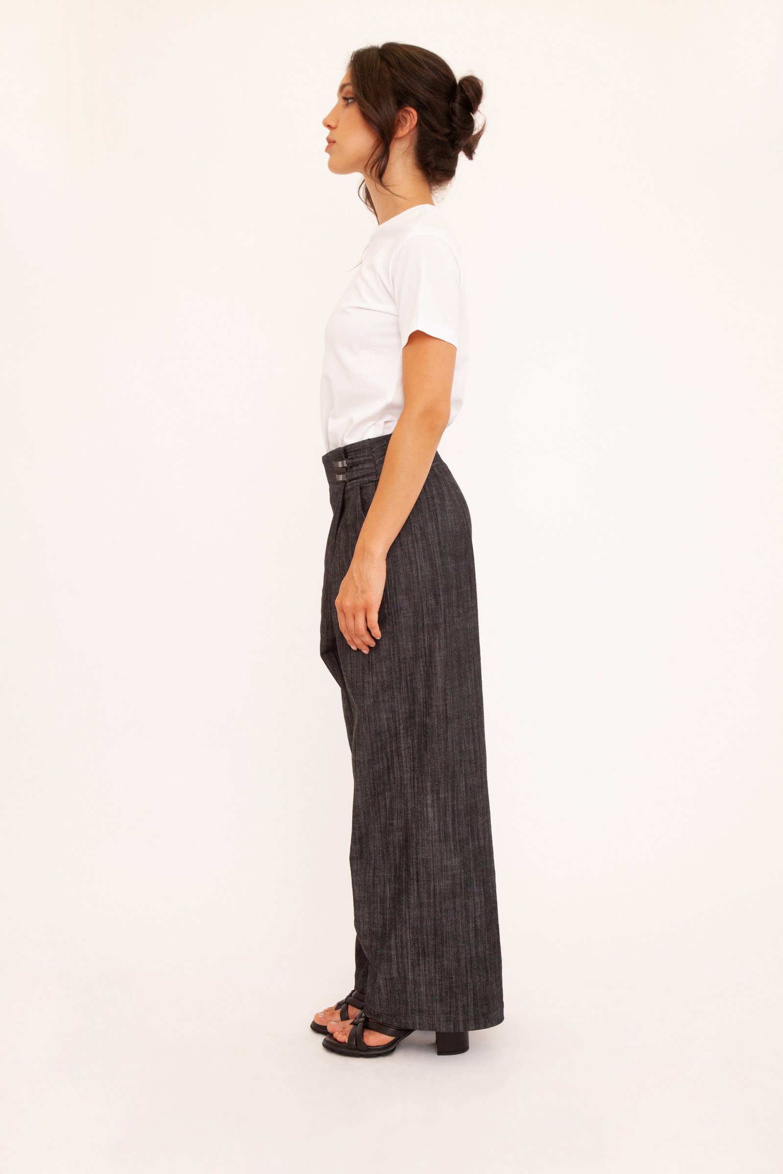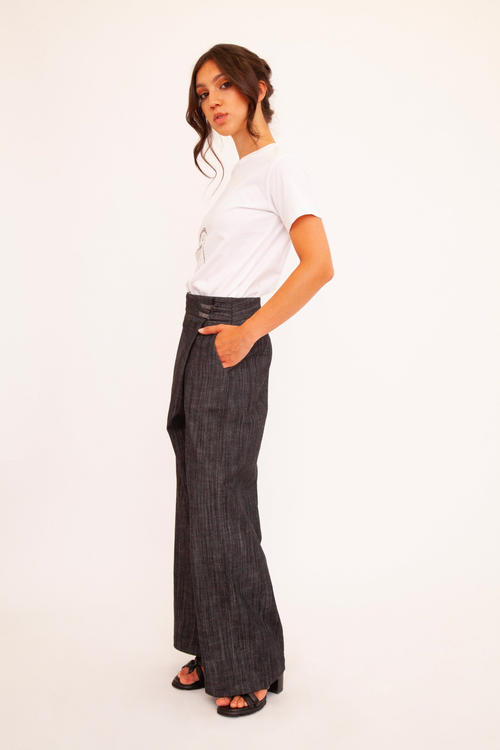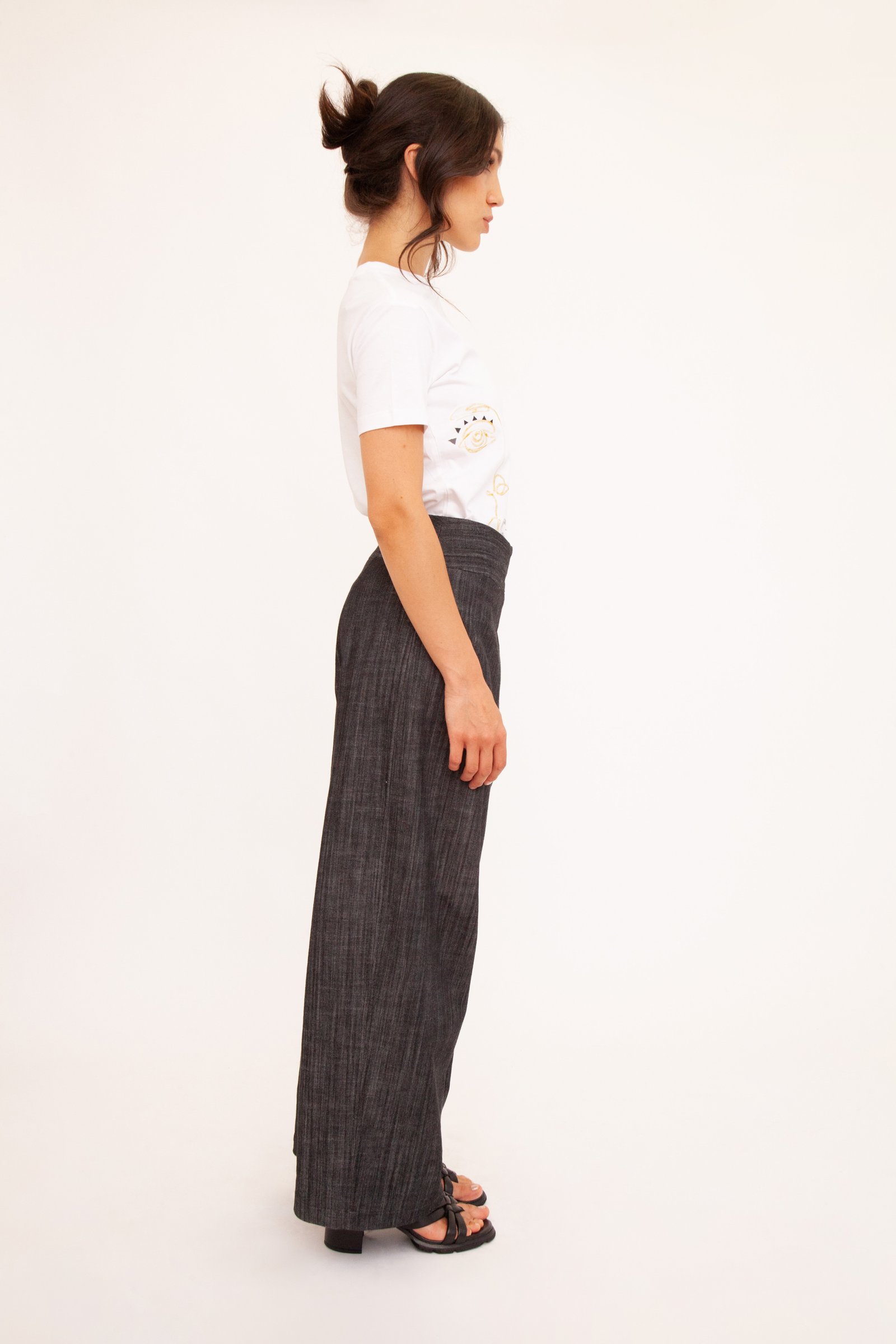 Il Pantalone Klimt disegna una silhouette scenografica grazie al suo volume ampio e fluttuante.