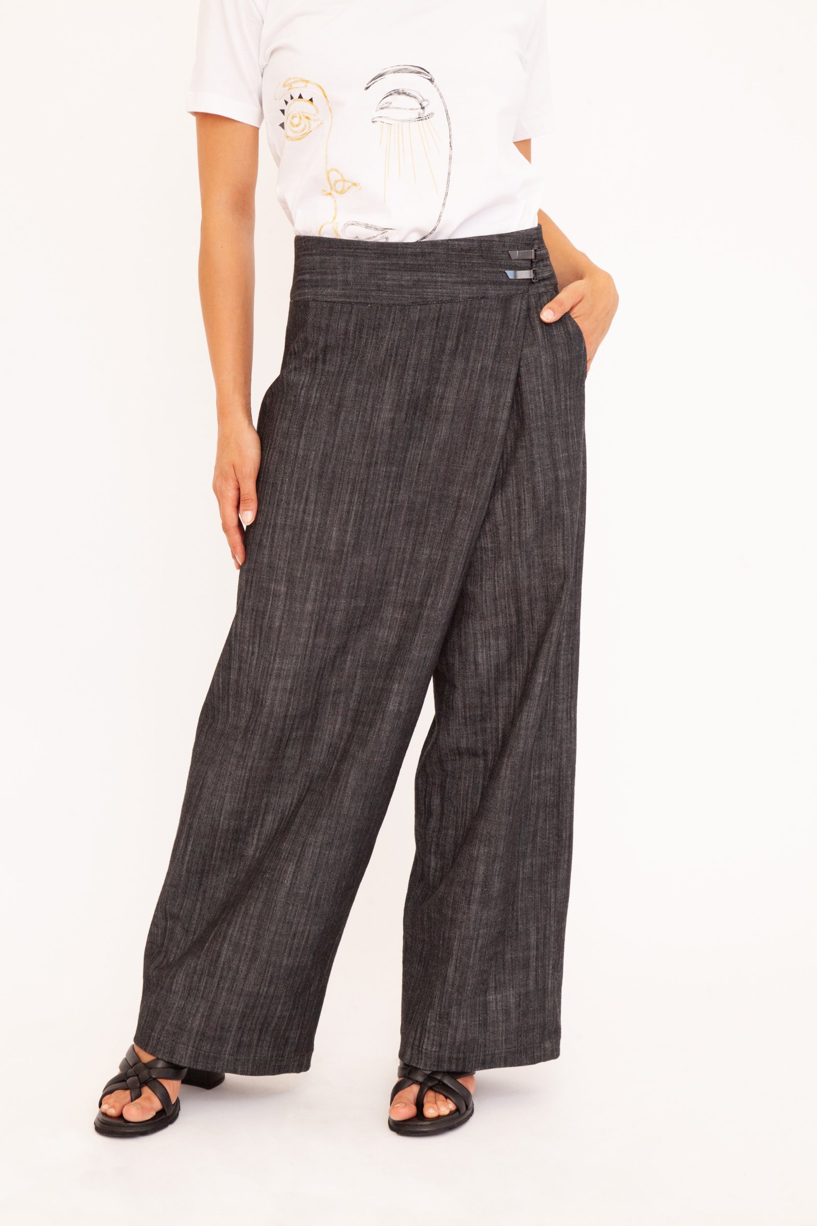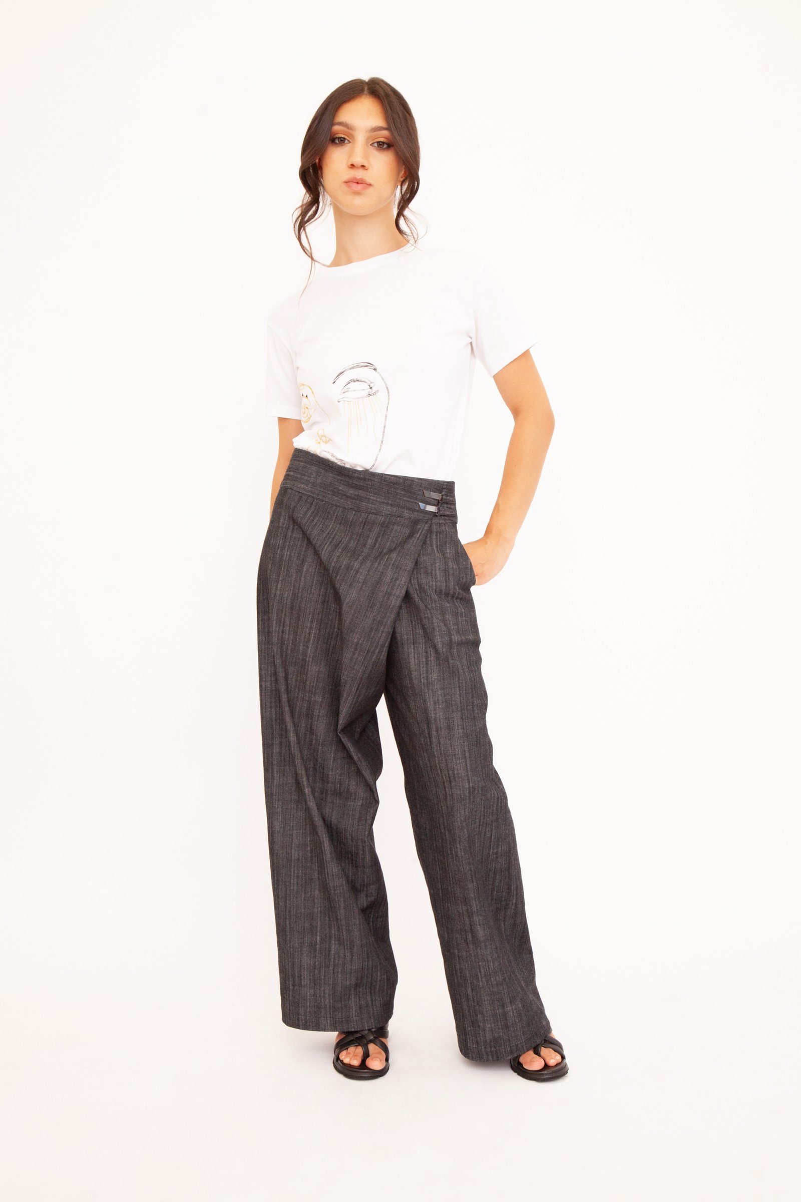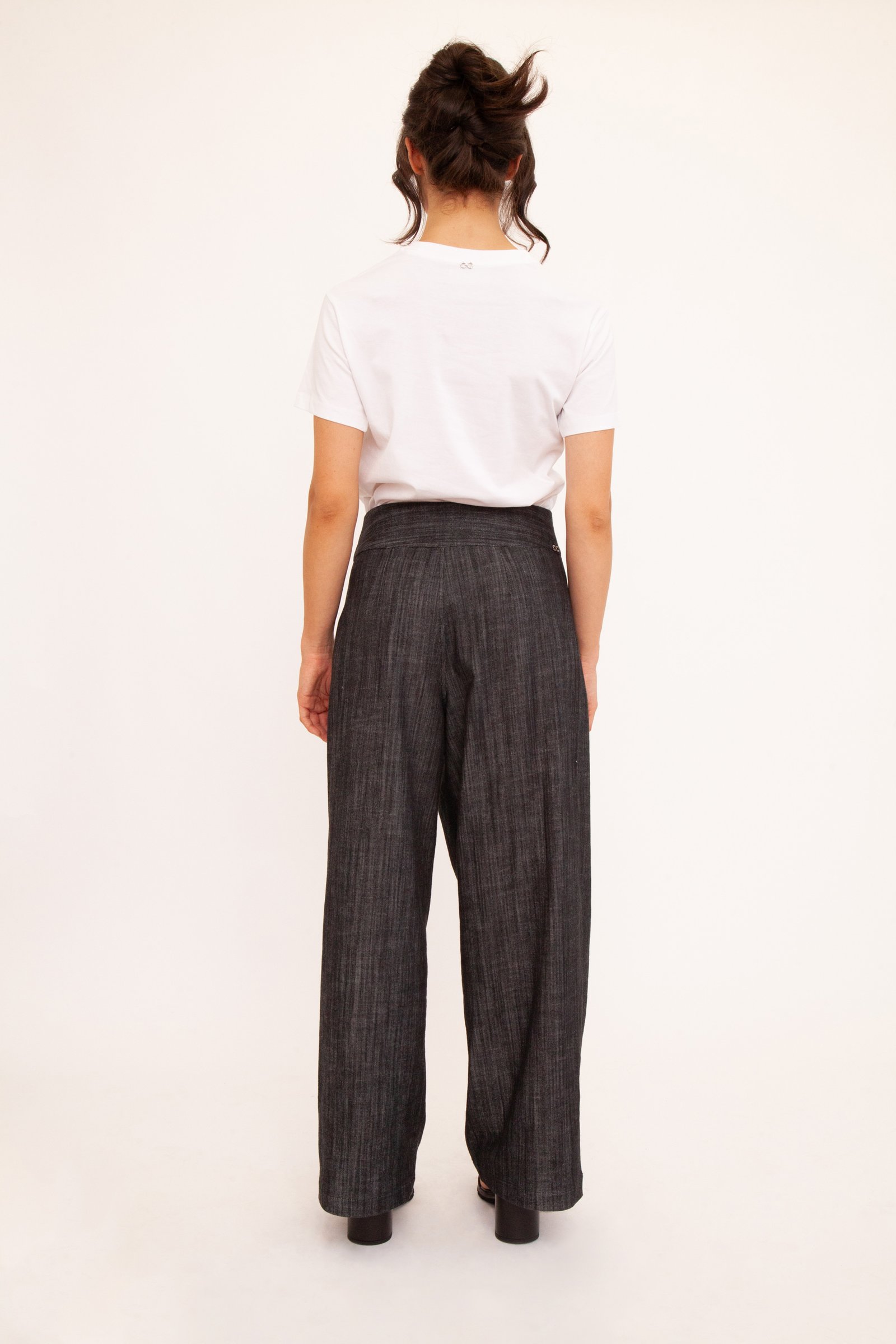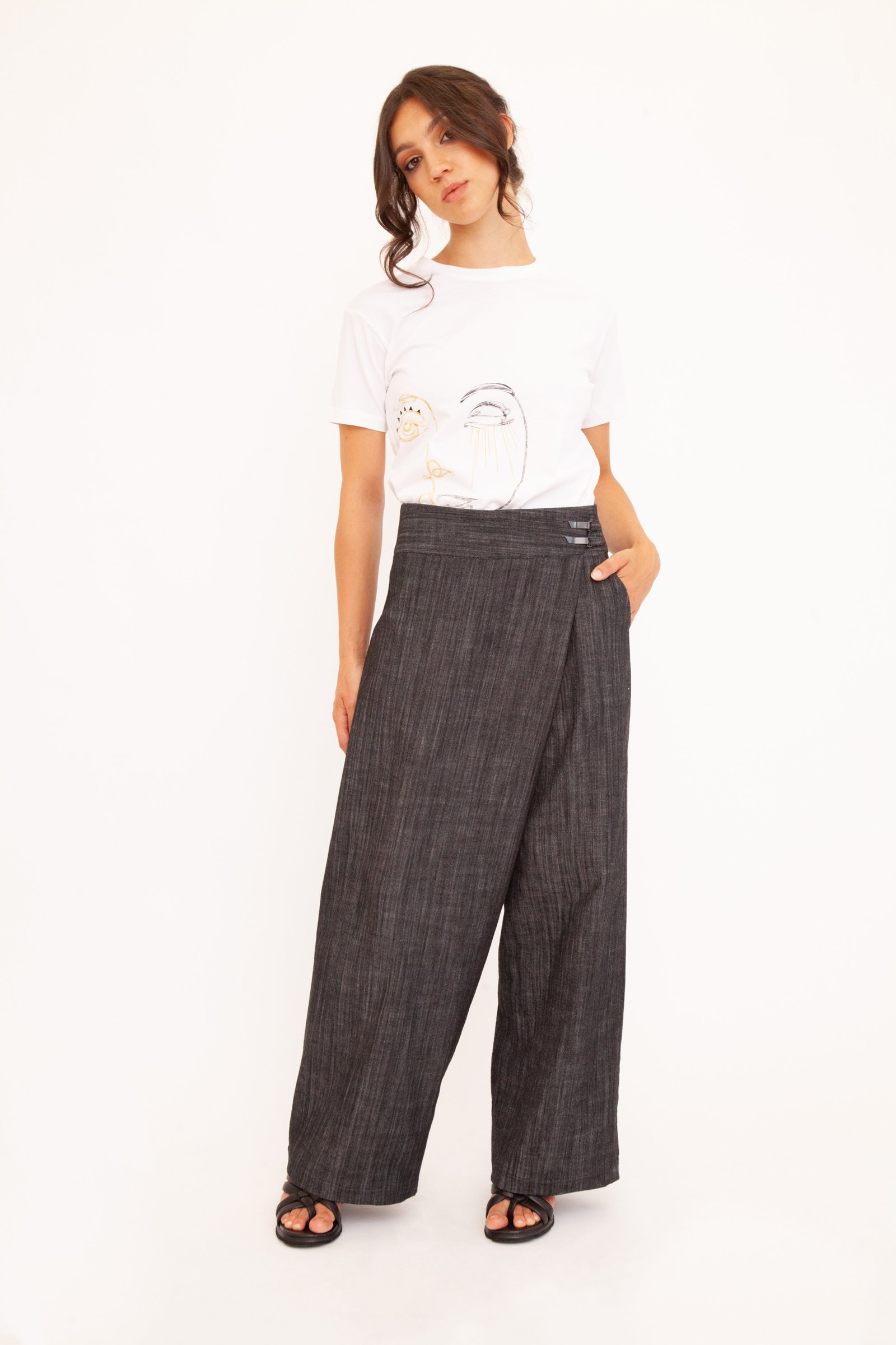 Il Pantalone Klimt disegna una silhouette scenografica grazie al suo volume ampio e fluttuante.