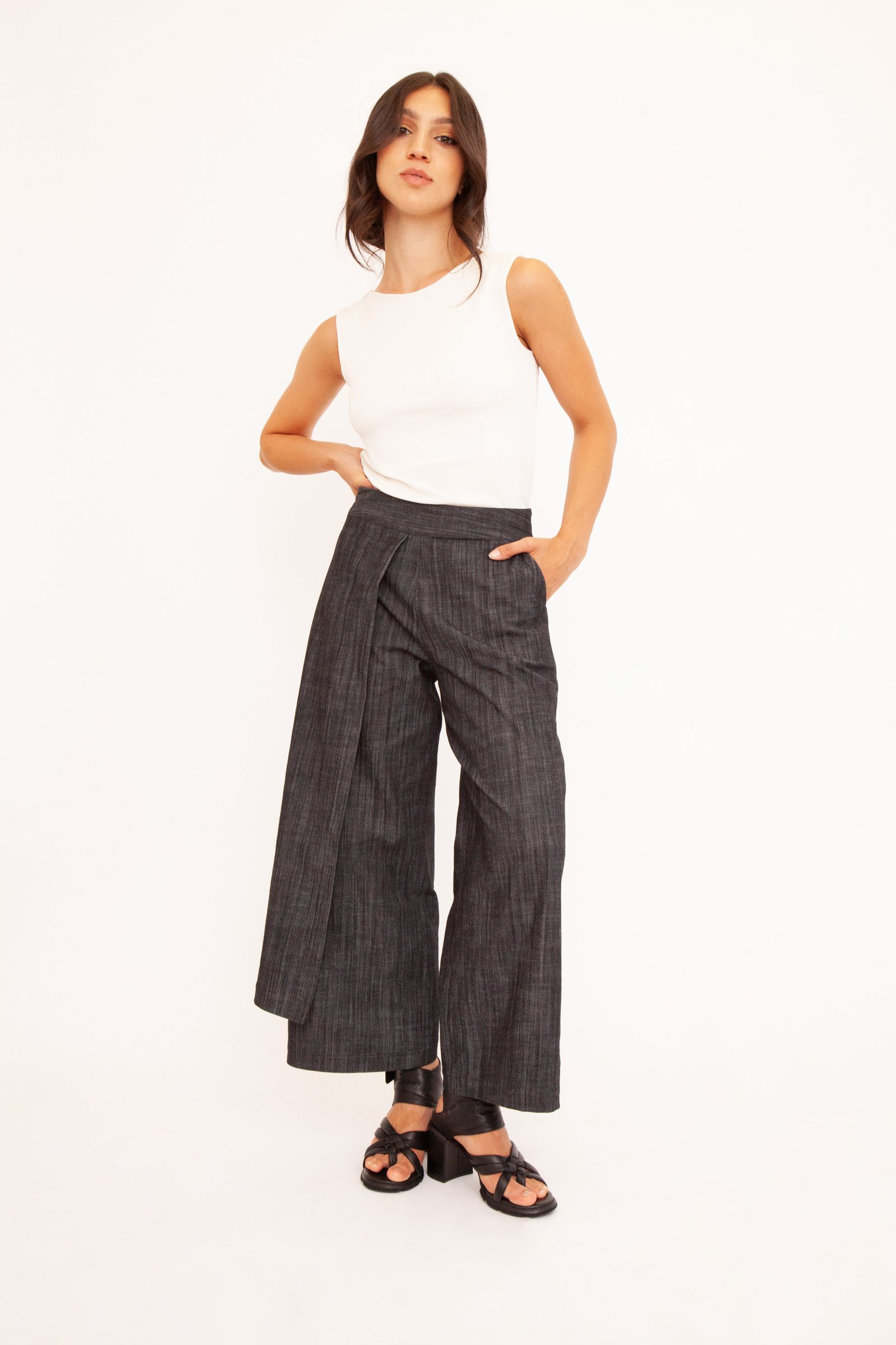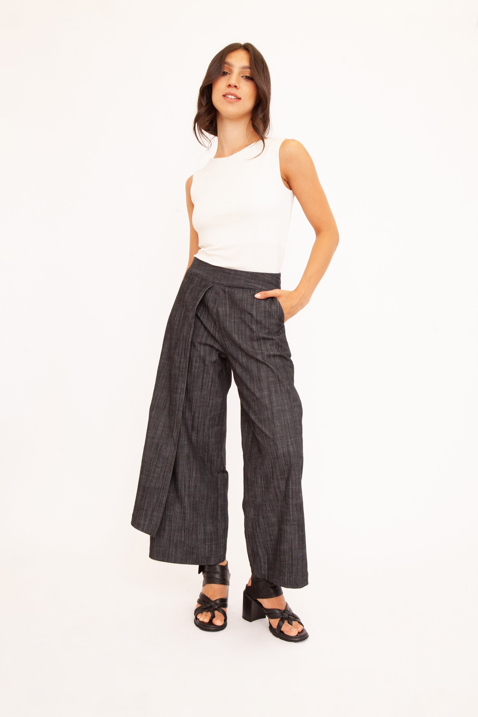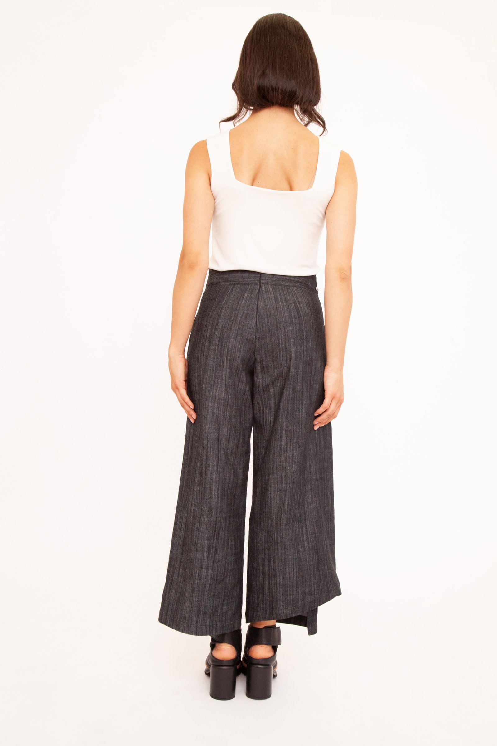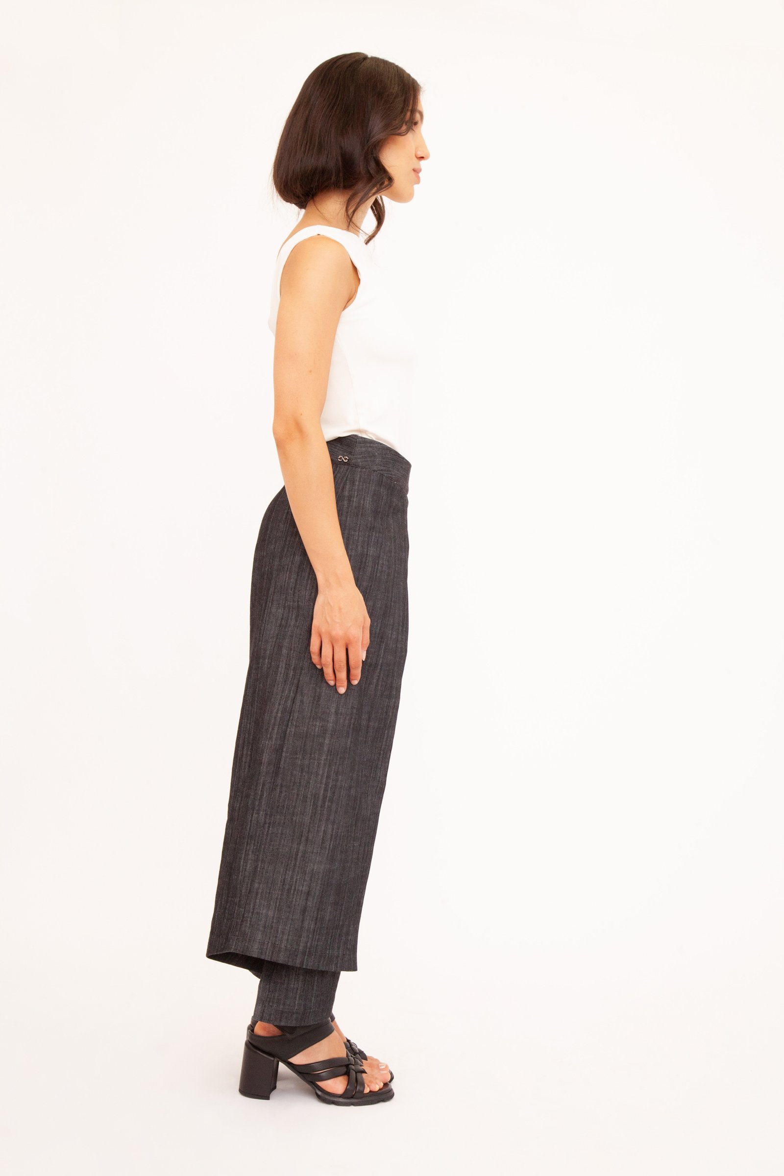 il Pantalone Sarah si distingue per l’armoniosa asimmetria della gamba destra, dove un profondo spacco laterale è svelato con discrezione da un pannello sovrapposto. La linea, ampia ma controllata, è rifinita da una zip posteriore invisibile per una vestibilità impeccabile.