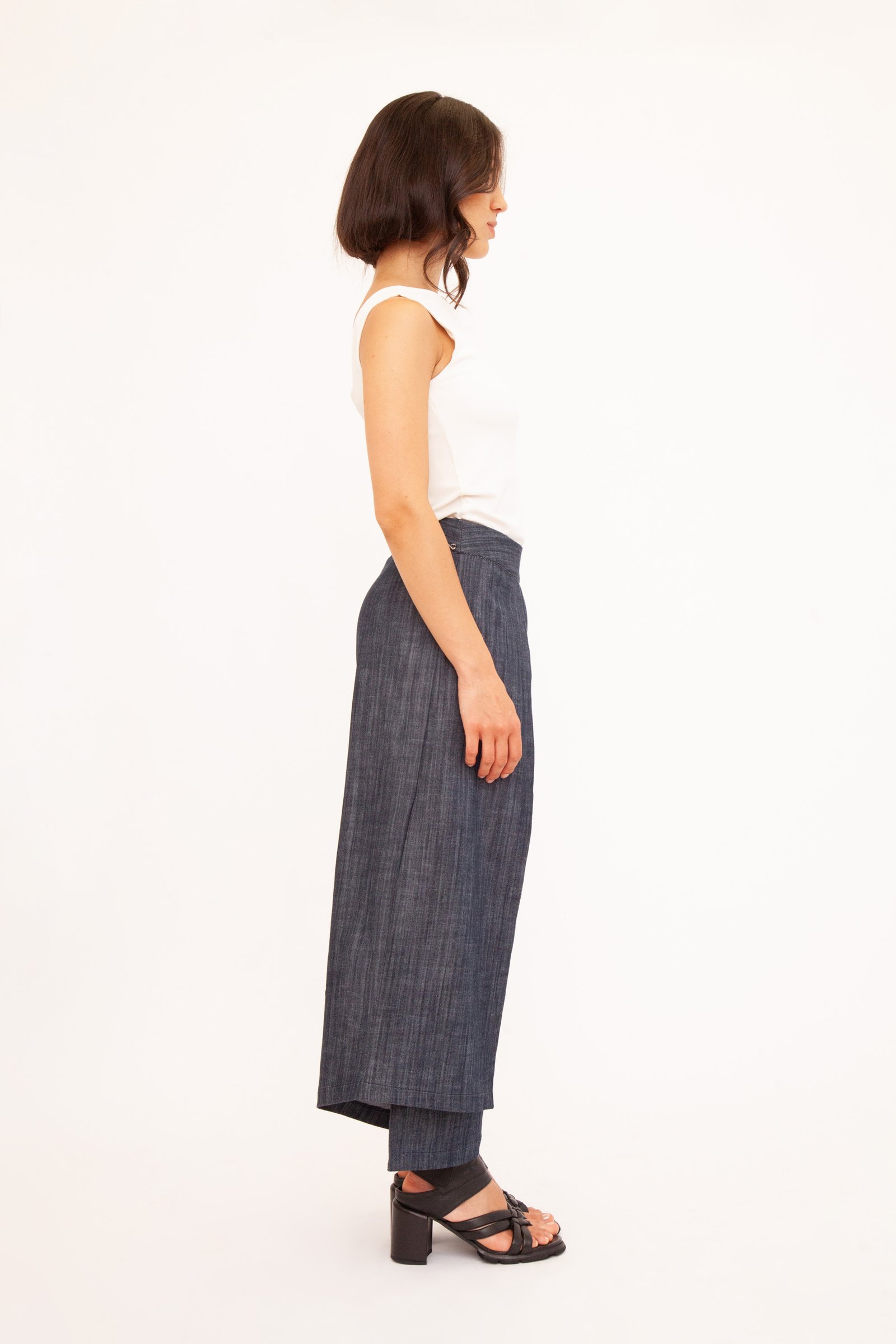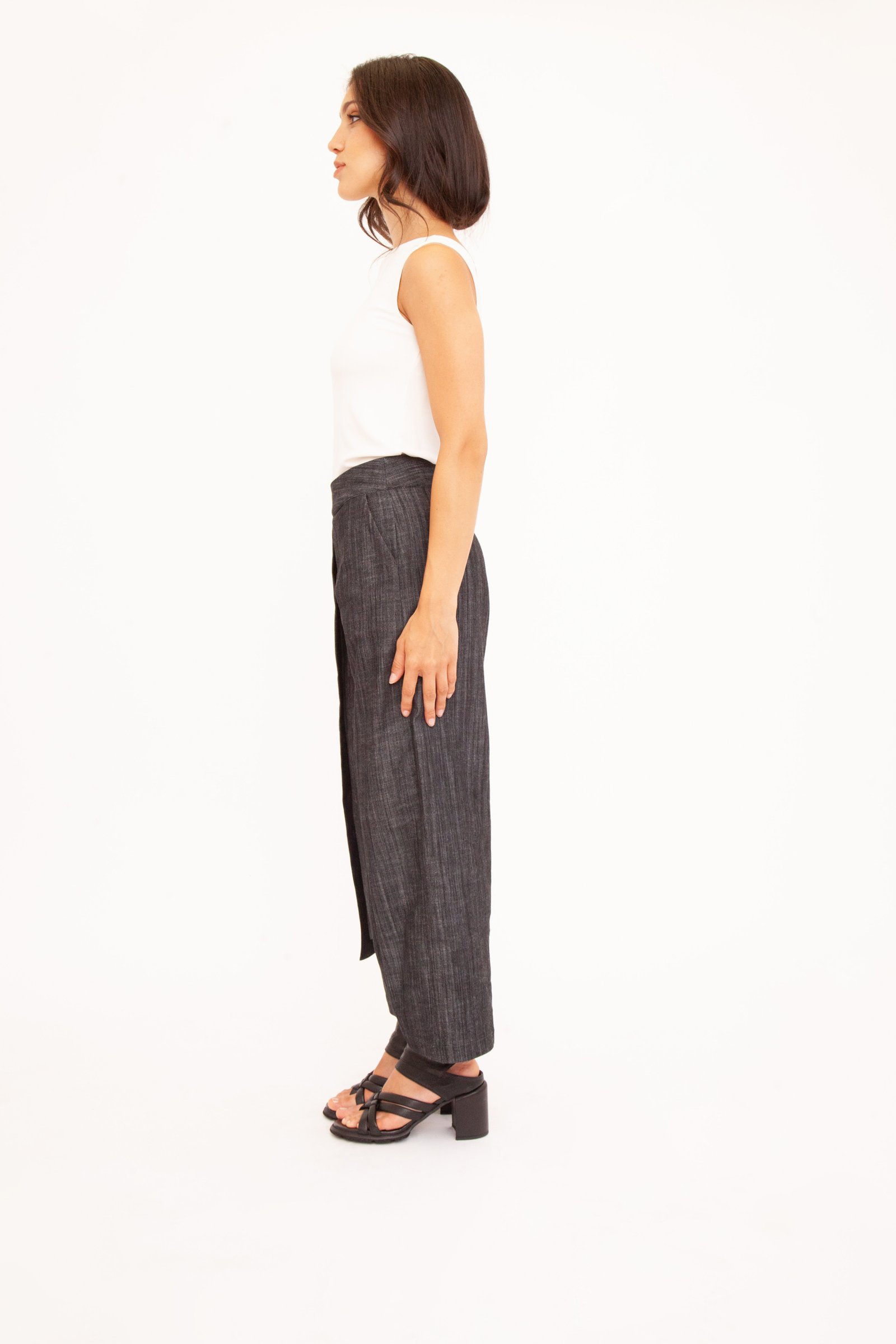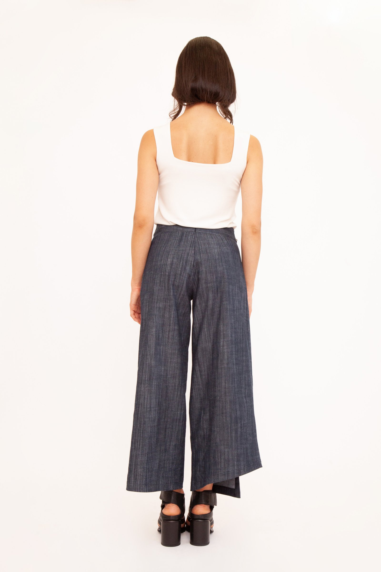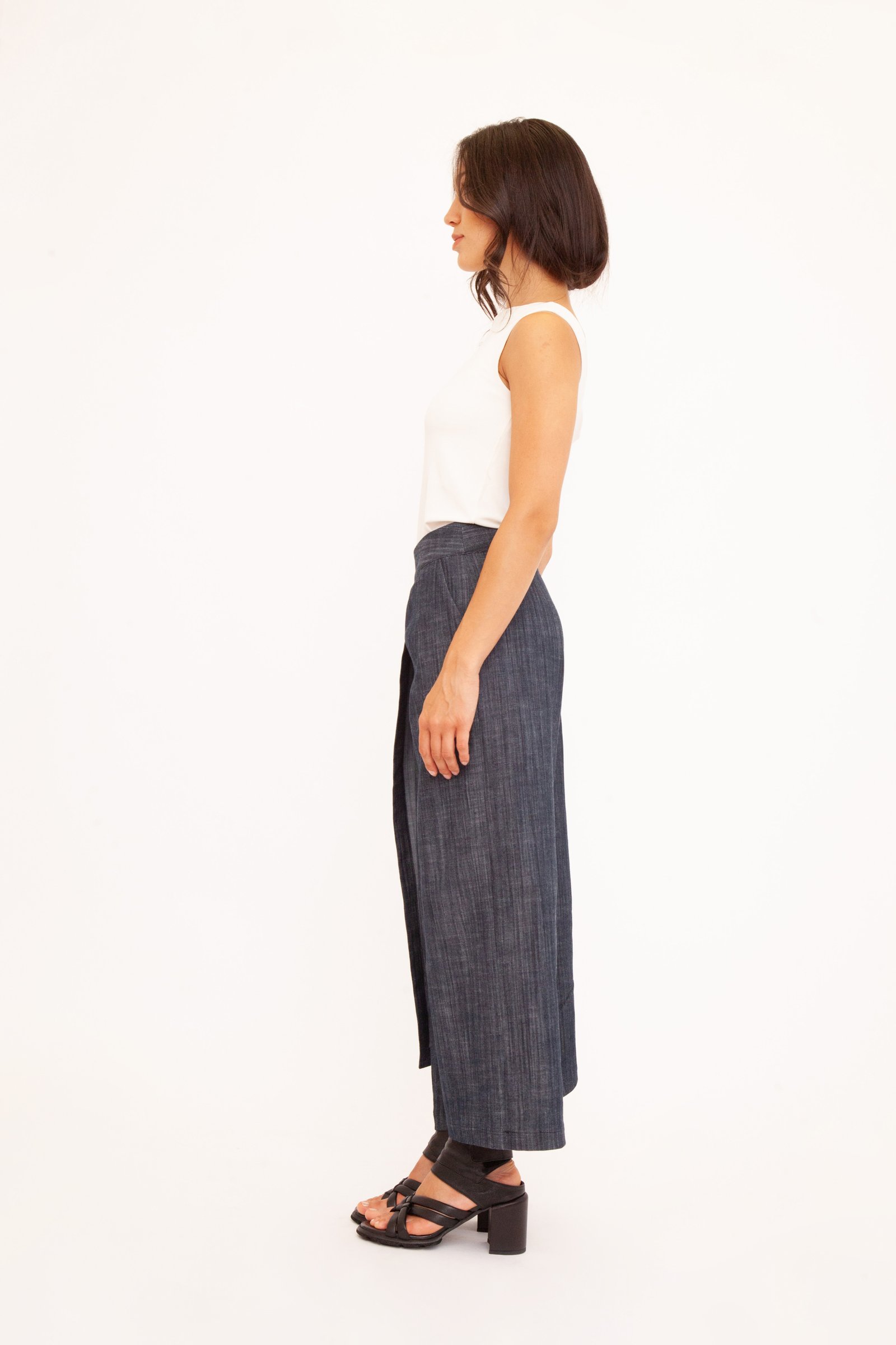 il Pantalone Sarah si distingue per l’armoniosa asimmetria della gamba destra, dove un profondo spacco laterale è svelato con discrezione da un pannello sovrapposto. La linea, ampia ma controllata, è rifinita da una zip posteriore invisibile per una vestibilità impeccabile.